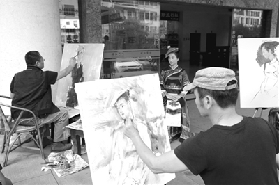 图为4月17日,几位美术名家正在作画,不同风格的毛南族姑娘跃然纸上。