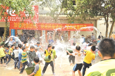 泼水活动增进民族情感。3月29日,马蚌镇举办跨省(区)民族团结壮乡歌圩活动,泼水环节最热闹。该镇准备的“疯狂泼水节”活动中,居民与游人、主人与客人,无不欢欣喜悦,一盆盆春日的吉祥水泼向对方,彼此湿的是衣裳,收获的却是满满的愉悦。欢声、笑声响遍每个角落,声声祝福拉近了广西、云南、贵州三省(区)接边地区各族人民的感情。