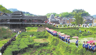 “五一”小长假期间,三江侗族自治县各景区彰显特色,以侗族大歌、情歌对唱、斗牛比赛、百家宴等缤纷多彩的民俗活动接待八方游客,让游客饱览风情,乐享假日。今年,侗乡充分用好全国旅游标准化示范县和广西特色旅游名县“两张名片”,着力紧盯项目、突出特色、狠抓管理,全力将三江打造成桂湘黔三省区交界处重要旅游目的地,今年1至4月,该县共接待游客280.8万人次,实现旅游总收入16.77亿元,同比分别增长19.6%和19%。图为4月29日,村民在程阳八寨景区表演情歌对唱。
