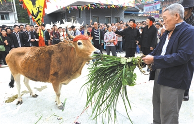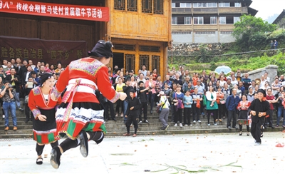 5月3日,龙胜马堤乡举办“敬牛节”,以此表达对耕牛的爱护和敬意。当地苗、瑶、壮等民族群众身着节日盛装汇聚在马堤村,开展民族服饰巡游,举行“敬牛”仪式、对山歌、打“泥脚”、顶竹杠、抛绣球、拔河等民俗活动,各族群众欢度“四月八”传统节日。