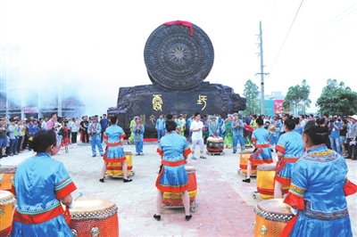 节日期间,在露圩镇铜鼓广场举行了蓝衣壮迎宾大铜鼓落成揭彩仪式。蓝衣壮迎宾大铜鼓融合了功夫、舞龙、舞貔貅狮、舞仙马、舞麒麟、舞彩凤、打钱尺等蓝衣壮民俗文化元素,为双面造型,两鼓面间距3.6米,鼓面直径4.8米,连底座总高度8.13米,重6吨。
