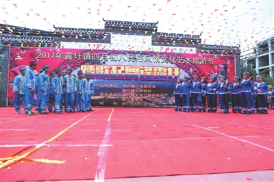 在热闹的鼓声中,民俗彩妆踏街巡游队伍从露圩大庙出发,舞龙、舞狮、舞彩凤、舞仙马、舞麒麟等露圩非物质文化遗产一一展现在游客面前,让游客充分领略了蓝衣壮民俗文化的独特魅力。四月八活动中还进行了《醉美蓝衣》首发赠书仪式,灰水糍、灰水粽、荷叶黑糯米饭、发糕等当地特色美食让游客流连忘返,露圩刺绣、壮锦等传统技艺展示活动,吸引了不少游客驻足观赏。