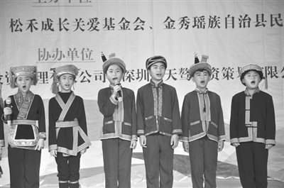图为签约仪式后,金秀瑶族自治县民族小学瑶族童声合唱团的孩子们给远道而来的嘉宾表演。(黄秀凤 摄)