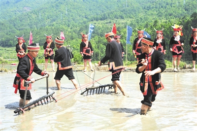 师公吹响远古深邃的开耕号子,全村瑶族群众在梯田里祈福、欢唱祈盼风调雨顺、五谷丰登的瑶歌,田里的耕犁也开始忙碌起来,场面蔚为壮观。5月14日,金秀瑶族自治县金秀镇金村瑶寨举办开耕祈福仪式,吸引了数百名游客前来参观。开耕祈福仪式结束后,游客和瑶族同胞一起体验了在梯田里捕捉禾花鱼的乐趣。