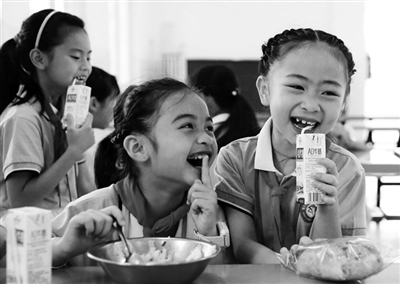 融水苗族自治县自今年3月起,在县城6所义务教育学校实施学生营养改善计划,使1.5万名学生吃上了健康放心的营养餐。近年来,随着城镇化和撤点拼校的发展,融水县城中小学校农村学生猛增,而县城学校目前未纳入国家农村义务教育学生营养改善计划。图为5月27日,在融水苗族自治县第三小学,几名学生正在吃营养餐。(龙 涛)
