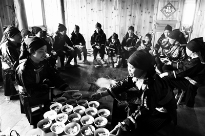 三江吃油茶还有很多讲究呢,大伙围着火塘坐,那碗香热的油茶就从靠近桌子的两头顺着座位传递过来,领到油茶后你可别急哟,要放在自己座位的面前,等主人说一声敬请时,才可以开始端碗喝。吃茶时主人给你一根削成片状的竹筷,每吃完一碗,你就只要将碗传递给主妇,她们会放好佐料茶水,再递给你的,要是你吃饱了就把竹筷架在碗上递过去,就说明你已经吃饱了。如果你只是递碗过去的话,说明你还想继续吃,当然了,主人也会热情地陪你吃到饱为止。