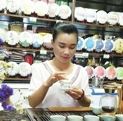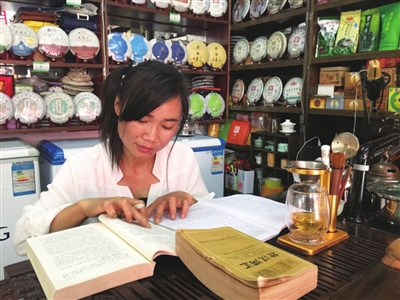 “我是壮族人,出生在宜州。初中毕业后就来到柳州生活、创业,从小对壮族山歌有着浓厚的兴趣。”6月2日,在鱼峰区西江路的一间茶叶店里,记者见到了达秀。娇小的身材、伶俐的面容,尤其是她的声音语调,婉转丰富得像鸣翠的百灵鸟。在她的茶叶店里,除了满室的茶叶外,最引人注目的就是一排壮语词汇书籍和一台连着录音话筒的电脑,“白天与五湖四海的朋友交流茶艺,晚上就喜欢在店里唱唱歌,交流交流壮语知识。”