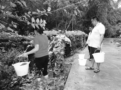 图为村干部在清扫垃圾。(本报记者 阮启枝 通讯员 张冠族 摄)