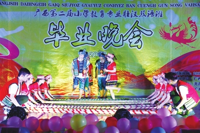6月20日晚,广西第二届小学教育专业壮汉双语班毕业晚会在广西师范学院长岗校区举行。自治区民语委副主任玉石,广西师范学院副厅级调研员常军胜,自治区教育厅民族教育处处长韦兰明,广西师范学院初等教育学院书记彭英彪、院长邹循东等领导出席并观看了毕业晚会。