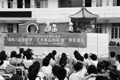 6月26日,由自治区党委宣传部、自治区文明办、自治区妇联主办,河池市文明办、广西木偶剧团责任有限公司承办的“喜迎十九大 争当时代小先锋”广西优秀剧目走进乡村学校少年宫巡演活动在环江毛南族自治县洛阳镇中心小学乡村学校少年宫精彩上演。活动中,广西木偶剧团的演员们给孩子们带来了《爱》、《孔融让梨》和《三个和尚》等精彩木偶剧。
