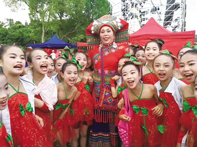 “山歌花树年年新,全靠众人挑水淋;三姐扁担交给你,要做山歌传承人。” 覃会长说,郭秀莲经常在校园教学生唱的这首歌,正好唱出了她的心声,她的人生,她的传奇。