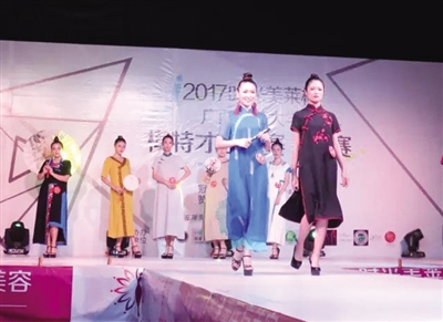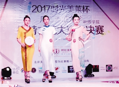6月16日晚上,2017“时光美莱杯”广西师范大学职师学院模特才艺大赛决赛现场,由广西师范大学职师学院火箭组合劲爆演唱一曲《歌曲串烧》,嗨翻了全场!在这个仲夏夜,携着阵阵香风,带着丝丝爽朗,披着点点星光,穿着片片云霓,迈着款款秀步,民族风原创系列时装,就这样款款出场了。这些婀娜的壮锦旗袍,融合了壮族织锦的五彩之美,还有那中华国粹的服饰之秀,体现了东方女性温婉含蓄的小家碧玉之气。这些壮锦袍子,柔和了传统时尚的服饰新款,极具中国文化包容开放气度,尽显着时代女性品质生活的风雅闲逸之派。这是壮锦元素从壮乡融进都市,这是民族服饰从传承走向弘扬,这是中华文化从传统融入时尚,这是中国名片从八桂传递世界!