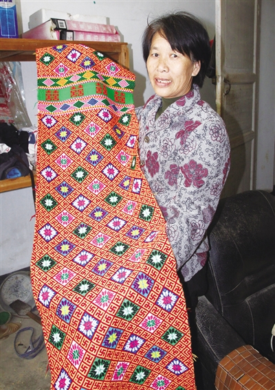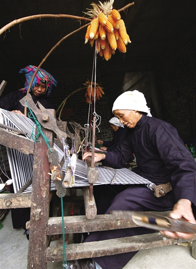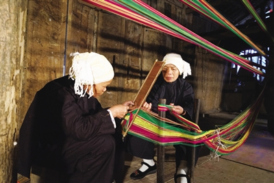 壮族土布制作工艺历史悠久,其制作工艺过程如下:第一步为纺线:纺线前,先用搓棉板把棉花搓成柱形小棉条。纺线时,先从棉条的一头抽出一根线头,固定在纺车的倒线轴上,然后右手摇动纺车,左手随着纺车的摇动,拿着棉条来回拉动,这样,一根根棉条就被纺成棉线缠于倒线轴上了。第二步为牵纱:牵纱是将已经纺好的棉线牵成经纱的过程。先在平地上根据需要织布的长度钉上木桩,一边钉两根,另一边钉一根,然后将十个线团分别穿在牵线机的十个滚动轴上,牵纱时,左手拿牵线机,于两边的木桩之间来回走动牵线,并把线分层套在木桩上,根据需要织布的宽度来确定牵纱的层数,线牵完以后,经过梳理,把每一根线穿在筘上,最后把经过筘的线整齐地裹在裹线筒上。第三步为织布:织布是编织布的纬纱的过程,织布前,先将牵好的线、裹线筒、摆子与织布机的各部件连接、安装好,织布时,织布者坐在织布机前端,双脚轮换踩踏板,控制上下两层经纱的分合,双手根据上下两层经纱的分合,左右丢梭,筘子也把一线一线压实,以保证布的密度,这样就织成布面。靖西土布,布料厚实而牢固;其色泽蓝里带青、青中透红,具有独特的风格。用土布制作成的各种衣、裤、儿童背带、被面等制品,式样古朴典雅,落落大方,图案花样多,格子、斜纹、水纹、“ ※ ”“卍”字形、双喜等,具有较高的艺术水准。