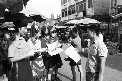 新颁布的《广西壮族自治区边防治安管理条例》将于2017年8月1日正式实施。为更好地宣传《条例》,方便出入境人员和边民群众了解、熟悉法律法规,7月26日,崇左市公安边防支队紧密结合辖区实际,选派100余名精通壮语、业务精通的法制骨干人员组成“普法宣传分队”深入辖区利用多种语言开展《条例》讲解与宣传活动。崇左市公安边防支队凭祥边防派出所“壮族普法分队”成员和派出所官兵通过发放中、越、壮三种语言印刷的宣传手册、设置横幅、张贴海报和咨询员现场讲解等方式,向过往边民群众集中宣讲《条例》的具体内容,并提供法律咨询服务,有效提升了边民群众对《条例》的认知和支持,受到群众的广泛欢迎,取得了良好的普法宣教效果。图为普法宣传分队向群众宣传《条例》。