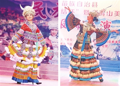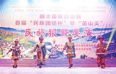 融水丰富多彩的少数民族服饰被学者们称为“穿在身上的史书”。7月23日,融水苗族自治县举行首届“民族团结杯”暨“苗山美”民族服饰展演,来自该县各乡镇以农民为主的代表队,通过走秀和歌舞表演来展示当地极富特色的少数民族服饰。