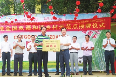今年3月初,我区崇左市宁明县城中镇馗塘村被国家民委、教育部命名为“首批全国双语和谐乡村(社区)”。7月17日,自治区民语委在馗塘村举行了隆重而简朴的授牌仪式,自治区民语委副主任玉石为该村授牌并出席馗塘歌坡节活动。