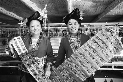 近年来,融水苗族自治县丰富多彩的民族文化吸引了众多国内外游客前来观赏、体验,传统的民族服饰、刺绣等民族产品销售量大增。当地结合实际,加大对民族服饰制作、刺绣等民族技艺培训力度,促进增收。据统计,仅绣花这一项,每名艺人每月就能增收1000多元。图为8月1日,在融水红水乡芝东新村,杜玉娇(右)、石艳姣(左)在展示绣花作品。(廖子渊)