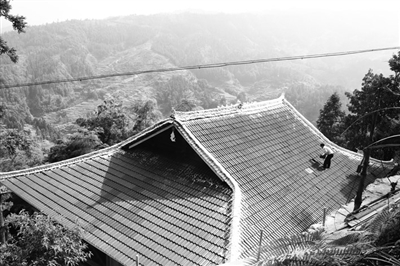 图为8月2日,该村村民韦梦良将其屋顶的瓦片作最后调整,完整拼出了“幸福黄奈”四个汉字。此外,其他村民还在屋顶拼出了“美丽苗山”“宜居乡村”等汉字。
