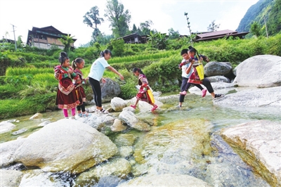 8月6日,在广西融水苗族自治县白云乡林城村城卡瑶寨,大学生志愿者史鹏举和王松鹤正在小心翼翼地护送几名瑶族学生过河去上学,笔者刚好经过捕捉到这个感人镜头(如图)。