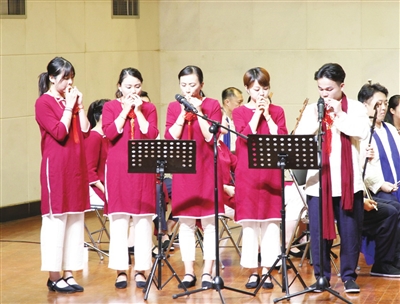 图为演员们用田螺笛演奏南路壮剧叹调。