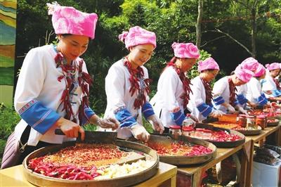 9月2日,龙胜各族自治县龙脊镇马海壮寨举行一年一度“辣椒节”。当地壮族群众开展摘辣椒、晒辣椒、剁辣椒比赛等趣味活动,吸引众多游客前来参与体验,共享丰收的喜悦。图为剁辣椒比赛。