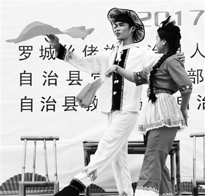 9月6日,罗城仫佬族自治县第二小学校园内,一场精彩的富于地方民族文化特色的戏曲演出活动受到师生的热烈欢迎。为进一步传承、弘扬优秀的民族文化,培养学生对戏曲艺术的兴趣,了解戏曲艺术的相关知识,感受地方戏曲的精华,该县将在全县城区及11个乡镇的47所中小学校开展“戏曲进校园”巡回演出活动,推动地方戏曲在少数民族地区的传承和发展。(谢顺珩 摄)