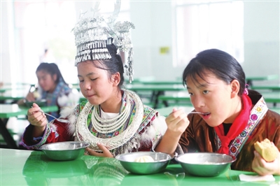 近年来,融水苗族自治县继续加大免费营养餐的投入力度,投入资金建设食堂,为学校配备消毒碗柜、蒸米器、冰箱等标准化的厨房用具,实行食品配送标准统一、食谱标准统一,让学子吃饱吃好。据统计,仅今年全县就有235所学校5.65万名学生享受免费营养餐,其中享受到中央资金投入的免费营养餐有247所学校4万多名学生,享受县级资金投入的免费营养餐有6所学校,1.5万名学生。