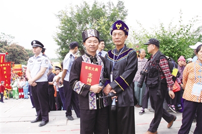 “Cingj Nazseng haeuj goengq(请那生屯进场祭拜),Nazbit guhndei cinjbi(那笔屯做好准备)。”因为壮语,因为深入研究壮文化,黄明标还有一个身份——布洛陀祭祀大典的壮语主持人。2005年至2014年,在每年农历三月初七至初九举办的百色市布洛陀民俗文化旅游节上,黄明标担任旅游节的重要内容布洛陀祭祀大典的壮语主持人,对着数十万的祭拜者和游客用嘹亮的壮语主持,这一主持整整做了10年。
