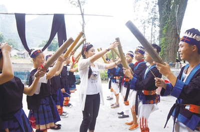 南丹县八圩瑶族乡以“千家瑶寨·万户瑶乡”易地扶贫搬迁旅游扶贫项目为契机,依托白裤瑶文化资源,拓展旅游空间,加快兴建民族文化广场、陀螺训练场、瑶族文化体验园等;组建铜鼓表演队、舞蹈队,并开发旅游商品等,让民族旅游文化与扶贫工作有机结合,让当地群众进一步增加收入。图为9月16日,该县文化馆老师到八圩瑶族乡瑶寨村大寨屯白裤瑶民族文化园辅导舞蹈队排练的情景。
