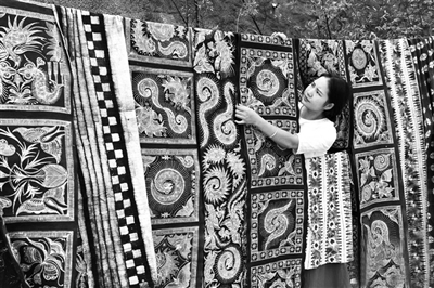 9月15日,贵州省黔东南民族职业技术学院毕业生唐启凤在晾晒工作室制作的蜡染成品。2016年10月,贵州省黔东南民族职业技术学院毕业生杨从森、唐启凤、韦绍媛和石庆兰,结合所学的旅游工艺品设计与制作专业知识,自筹资金,在母校的创业园内合伙开办了“黔承世锦”创客工作室,主要创作和经营蜡染、刺绣、银饰等民族手工艺品。他们的产品兼具民族特色和创意时尚,不仅在多次比赛中获奖,还备受年轻顾客青睐,网上销量良好。经过近一年的发展,“黔承世锦”创客工作室创作产品万余件,创收近30万元。
