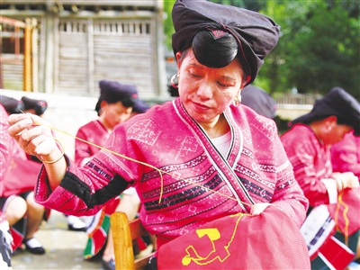 9月21日,龙胜各族自治县泗水乡瑶族妇女在参加绣党旗比赛。当日,该县泗水乡开展“瑶绣绣党旗,喜迎十九大”民族刺绣竞技比赛,预祝党的十九大胜利召开,祝福国家繁荣富强。