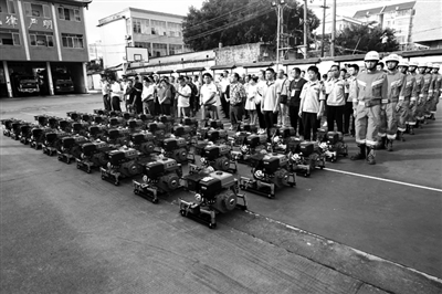融水是以苗族为主的少数民族自治县,区域内村寨房子以木楼为主,容易引发火灾事故。9月26日,融水苗族自治县通过财政拨付219万元专项资金,给20个乡镇配备438台手抬机动泵,为200余个行政村在风干物燥的秋冬季节进一步筑牢“防火墙”。图为消防器材发放仪式。