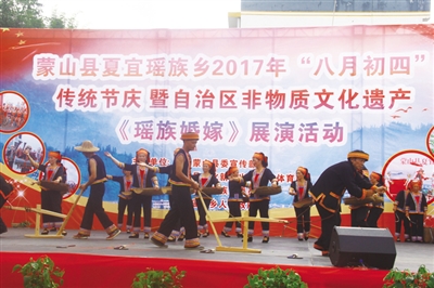9月23日,蒙山县夏宜瑶族乡瑶族同胞欢庆“八月初四”传统节日。农历八月初四是夏宜瑶族乡传统节日,当地瑶族同胞载歌载舞庆祝自己的盛大节日。当天,夏宜瑶族乡举行2017年传统节庆暨自治区非物质文化遗产《瑶族婚嫁》展演活动,同时还进行“捉鱼”“捉鸡”“跑三赛”等丰富多彩的民间节庆活动,当天共有4万多人参加了庆祝活动。
