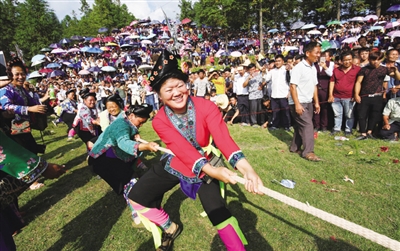 10月7日,在融水苗族自治县红水乡高文苗寨,几名苗家女在进行拔河比赛。