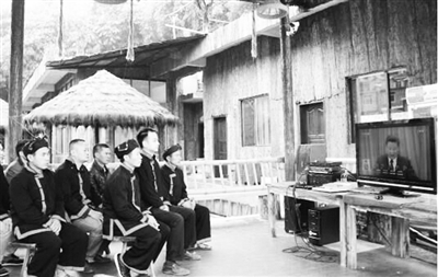 图为长垌乡古占瑶寨瑶族群众身着节日盛装认真聆听习近平总书记做报告。