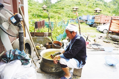 2005年,看准了机会的黎明宝靠搞木材生意积攒下来的资金,来到地处里湖瑶族乡政府所在地的里湖街口买了一块地,盖起一幢4层的楼房,从此,他干起了经营铜鼓的行当,至今一干就是12年。黎明宝说,厂家生产的铜鼓,声音需经过调试才能使用。所以,他买进的每一面铜鼓,都要经过不断的打磨调试才能卖出去。他说,调试铜鼓要有耐心有技术,没有技术,就调不好。而调好一面铜鼓的声音,最少得花一个星期的时间。