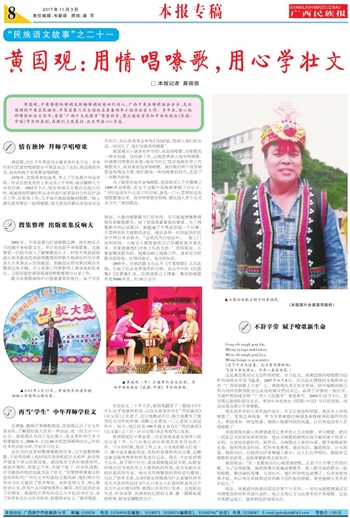 现在,快要退休的黄国观还经常下乡采风,一有时间就整理通过采风搜集到的材料并进行创作,他立志用壮文写出更多的平果嘹歌、记录平果源远流长、独具特色的地域文化。