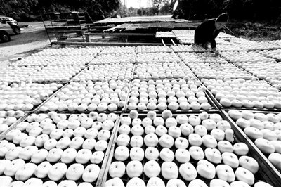 图为11月4日,恭城莲花镇红岩村村民在晾晒柿饼。