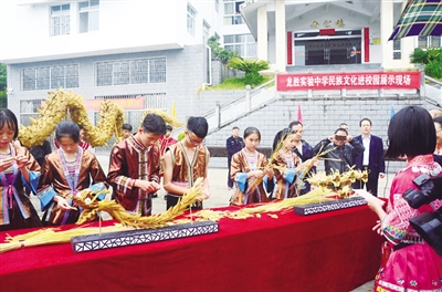 当天下午,龙胜实验中学全体师生以热情活泼的芦笙迎宾曲、经典柔美的古筝琴声、悠扬动听的葫芦丝乐曲、精彩纷呈的民族传统趣味运动会迎接100多名与会人员的到来。在欢乐的锣鼓声中,嘉宾观看了草龙表演及书法、结艺、剪纸等民族工艺的展示,感受到民间传统文化的魅力。在现场交流会上,龙胜实验中学校长梁结介绍了该校民族文化进校园工作的经验。
