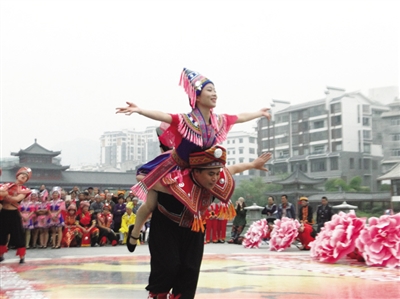11月5日,蒙山县在长寿阁舞台举行民族民俗文化展演活动,精彩的节目令观众大饱眼福。当天,来自全县的多个民间文艺代表队表演了舞狮、跳竹竿、抛绣球、民族舞、蒙山山歌等内容丰富、形式多样的节目,吸引众多的游客驻足观看,饱尝了一顿丰盛的民族民俗文化大餐。