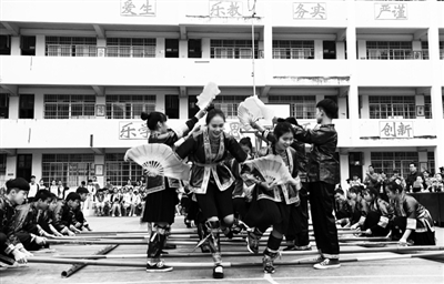 图为学生们在跳竹竿舞。(通讯员 龚普康 摄)