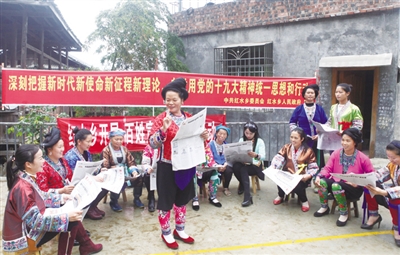 连日来,融水苗族自治县组织人大代表和党员以山歌、读报纸等方式,走进农村、企业、机关、社区、学校宣讲十九大精神,让党的十九大精神传遍苗山千家万户。