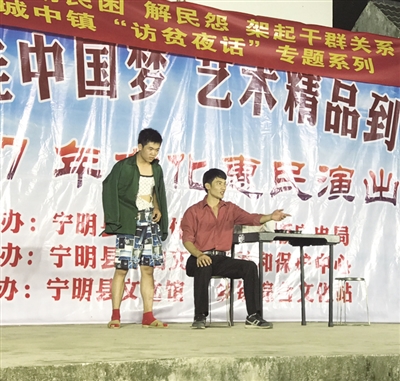 11月9日,宁明县花山文化传承和保护中心的演员在城中镇纳利村文化惠民演出晚会上,表演了寓意深刻的精准扶贫主题小品《懒汉脱贫》。