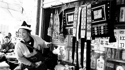 家住南丹县八圩瑶族乡瑶寨村大寨屯的黎凤珍,今年41岁,是地地道道的白裤瑶族。从2015年开始,她把生意从乡镇做到了县城。她在县城租了月租金为300元的一个摊位,每逢圩日,她早早地就把白裤瑶服饰、腰带,以及制作服饰所用的土布、花线等摆放在铺位上,等候顾客的光临。她说每个圩日销售收入有1000多元。