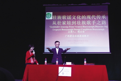 11月28日,广西著名壮族民间歌手陆正信在广西师范学院长岗校区给该院壮汉双语系学生做题为《壮族歌谣文化的现代传承——从壮家娃到壮族歌手之路》的讲座。