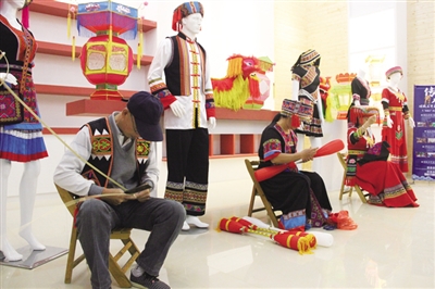 恭城瑶族自治县的“张福记”民间作坊已有上百年历史,“张福记”以传承和弘扬中华优秀传统文化为宗旨,以发展和推广少数民族文化为己任,积极宣传推广瑶族传统工艺品制作手艺,图为“张福记”第五代传人在展示瑶族刺绣、瑶族铜鼓、瑶族竹编等少数民族工艺品的制作过程。