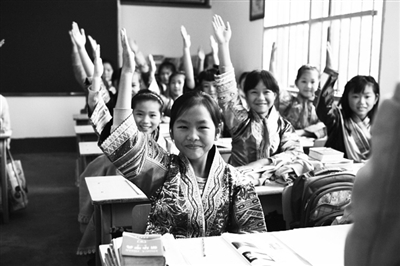 图为 11月29日,在融水苗族自治县白云乡中心小学,女童班的学生在课堂上踊跃举手回答问题。