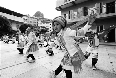 龙胜各族自治县龙胜幼儿园举行“民族文化教育”主题活动,小朋友们身着苗、瑶、侗、壮等民族服饰开展打陀螺、舞草龙、唱团歌等活动,载歌载舞接受民族传统文化的熏陶。图为12月8日,该幼儿园的孩子们在跳舞。