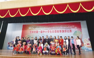 为纪念国务院颁布《壮文方案》60周年,推进民族文化进校园,12月8日,由凭祥市民语办牵头,市民语办与市民族局、市教育局共同举办的凭祥市第一届中小学生壮语故事比赛在凭祥市第一中学举行。从凭祥市各中小学校选拔出来优秀的18名中小学生参加了比赛,他们当中年龄最大的14岁,最小的仅9岁。