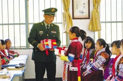 12月21日,中共十九大代表、武警广西总队柳州市支队政委何方礼再次到融水苗族自治县白云乡中心小学看望红瑶女童班的学生们,并给她们带去学习用品,鼓励她们好好读书,将来成为国家有用之才。